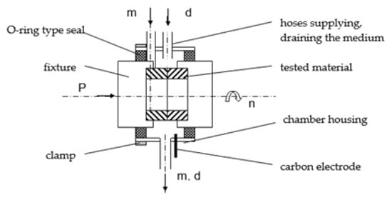 A special test chamber was made for corrosion testing (Figure 5). The chamber for testing of abrasion–corrosion processes was made of plastic. The grips of the test material were made of polyamide, the chamber housing was made of PVC, and the medium supply and discharge hoses were made of Teflon.