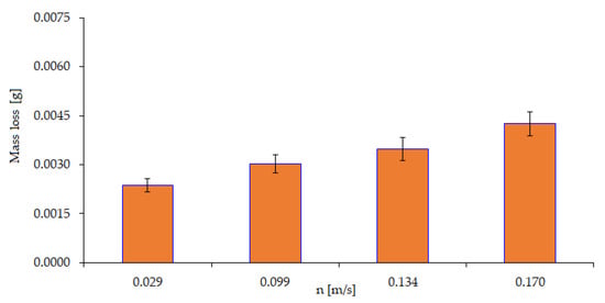 The results show that there is variety of wear depending on changes in test speed. An increase in speed causes a significant increase in wear. From this observation, it follows that rotational speed is a variable that can significantly affect the wear processes that occur. Experiment III (Table 1) is a methodological variant of the study involving only the corrosion factor. Figure 7 shows a graphic image of the quantitative results obtained as well as the trend of changes in corrosion wear depending on the concentration of the corrosive agent, which was sulfuric acid.