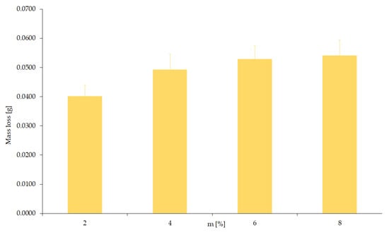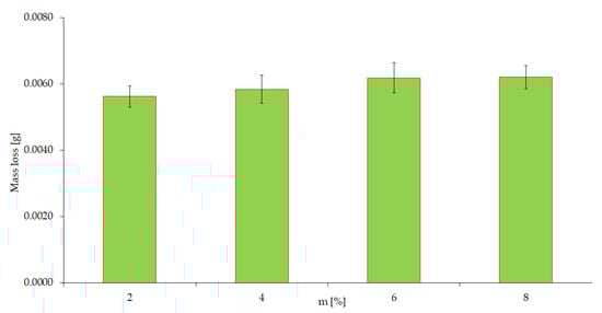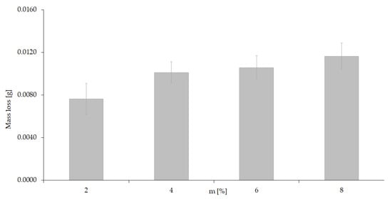 Tests were conducted for four different concentrations of sulfuric acid (2, 4, 6, 8%) using abrasive with a size fraction in the range of 0.1–0.2 mm and mechanical forcing (0.1 m/s, 20 N)—Figure 10—and tests for four different abrasive fractions (0.05; 0.1; 0.2; 0.3 mm) at a constant concentration of 4% H2SO4 and mechanical forcing (0.1 m/s, 20 N)—Figure 11.