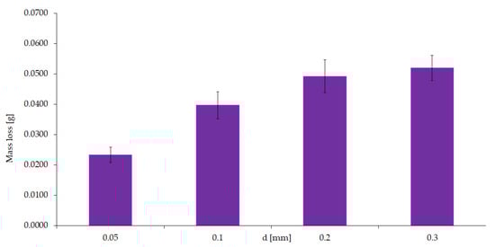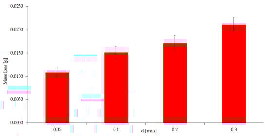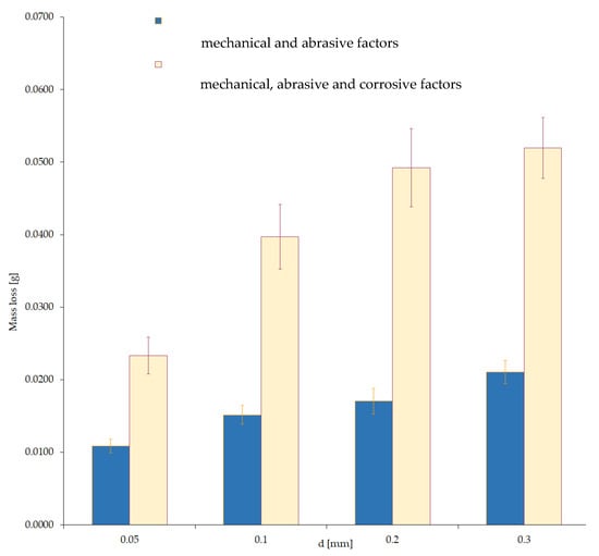 The experiment according to variant IV is a study with the simultaneous participation of mechanical and abrasive factors without the participation of a corrosive factor. Tests were performed for different abrasive fractions (d = 0.05; 0.1; 0.2; 0.3 mm) with constant mechanical forcing (0.1 m/s, 20 N). The results of this test are shown in Figure 8.
