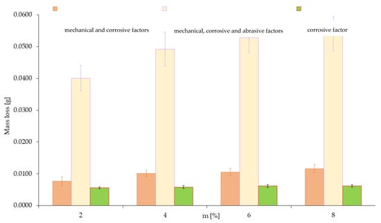 A comparison of the obtained results from wear tests with the interaction of a corrosive agent, mechanical–corrosive agents and mechanical–corrosive–abrasive interactions is shown in Figure 13. From the data in this figure, it is clear that the interaction effect caused by abrasive interactions is significant. The presented results clearly show that total wear is not a simple superposition of the individualized effects of friction and corrosive processes. Thus, the conclusion that the wear effect caused by the interaction of mechanical and corrosive excitations is not a simple sum of wear values resulting from excitations occurring independently was confirmed experimentally.