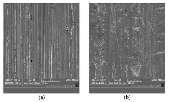 The authors of the paper [31] studied the influence of different degradation mechanisms occurring during corrosion–abrasion tests. For neutral test conditions, sliding abrasion significantly affected the wear of martensitic stainless steel. Nevertheless, lowering the pH changed the wear-inducing factor. The dominant role was taken by corrosion and the synergistic effect between corrosion and abrasion wear. Similar results were obtained by the authors of this article, where the addition of a corrosive factor significantly affected the result of wear (mass loss) compared to the situation where only the mechanical factor and abrasive wear interacted on the tested surface of the samples. The addition of a corrosive agent causes twice as much wear (mass loss) compared to the effect of only mechanical agents and abrasive. The surface of the sample after wear process was presented in Figure 14.