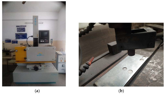 The demand for high-strength materials is continuously increasing in the engineering industries due to advancement in the field of materials and theability of machines to make them harder [1,2]. Electric discharge machining (EDM) is one of the most preferred methods for producing parts of complicated profiles with high accuracy. The machining of hard and brittle materials is preferred through EDM, as machining in conventional processes is expensive and incurs a high tool wear rate [3,4,5]. Discrete electrical sparks produced by electrical energy are utilized in the EDM machining process to erode material away from the workpiece [6,7]. The workpiece and the tool are submerged in the dielectric medium during this operation. The workpiece and the tool are submerged in dielectric fluid while being separated by a very small gap during EDM cutting. The material on the workpiece’s surface reaches extreme temperatures due to the discharge energy during the spark, which causes the material to burn [8,9]. The residue is then flushed away by the dielectric medium. The various parameters that affect the results of EDM are the pulse current, servo voltage, pulse on time, pulse off time, dielectric medium, and electrode material [10,11,12].