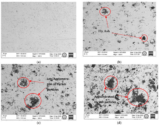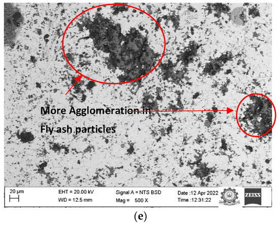 The picture below displays the SEM micrographs of several composites created using the P/M approach, as well as pure copper. Figure 3 shows the matrix (copper) as a white area and the reinforcement as a black area (fly ash). The agglomeration of fly ash in the composite rises as the reinforcement ratio does, as shown in Figure 3b–e. It is evident from Figure 3c,e which represent the composites with 5% and 10% reinforcement, in Figure 3c, that the agglomeration of fly ash is less compared to the micrograph shown in Figure 3e.