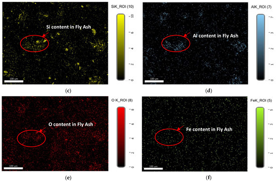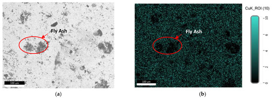 Figure 4 displays the EDX mapping of various composite elements. Through Figure 4a,b, it is evident that the white background in the SEM images is copper. It is clear from Figure 4c–f that the fly ash is represented by the black areas in the SEM picture (Figure 4a) represents the components Si, Al, O, and Fe. The black background in Figure 4a represents the fly ash which can be seen from Figure 4b since in the same area copper is not available in the same area, which shows that the area represents the reinforcement. The same is proved from the Figure 4c–e which shows the higher concentration of Si, Al and O which contributes to the major composition of fly ash. In Figure 4f the Fe concentration is sparse due to less availability of Fe in the fly ash according to the chemical composition.