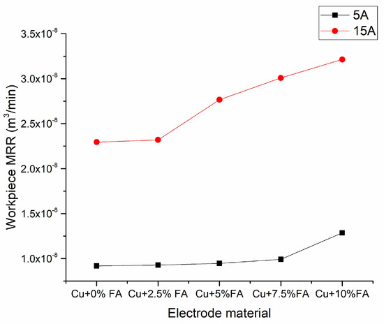 - Regardless of the use of different composite electrodes during the machining process, the MRR dramatically increased with the increase in current amplitude from 5A to 15A.