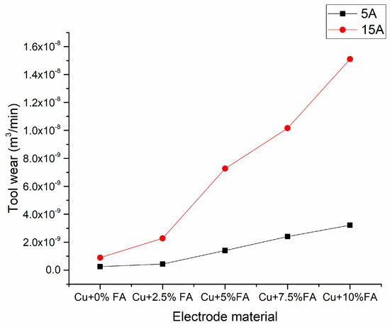 Figure 6 shows that, under both ampere circumstances, tool wear increases as the fly ash content in the tool increases. As the ampere increases from 5A to 15A there is a drastic increase in the tool wear rate. The slope of the tool wear rate increases with an increase in fly ash content.