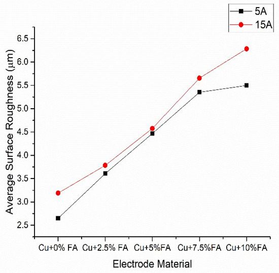 Figure 5 shows the results of the MRR of the SS304. The SS 304 is machined with five different electrodes under 5A and 15A current with other parameters kept constant which is shown in Table 2. From the results, it is inferred that as the ampere A increases from 5 to 15, irrespective of the electrode used, the MRR increases. However, for the same amperage used, the composite electrode with 10% fly ash shows a better MRR compared to the other electrodes. As the composition of the fly ash increases, the MRR is also increased for both 5A and 15A conditions, and a similar trend is noted on the tool wear.