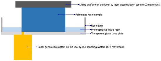 A schematic diagram of the fabrication process in the SLA is shown in Figure 2, and it can be observed that the material forming process consisted of line-by-line scanning and layer-by-layer accumulation. For the initial statement, the photosensitive liquid resin was introduced into the resin tank, and the bottom of the lifting platform immersed into the liquid level. The thickness of each layer was controlled by the distance between the bottom of the lifting platform and the top surface of the transparent glass base plate. In the fabrication process, the laser spot scanned line-by-line to form a 2D section under the control of the computer program, and the photosensitive liquid resin in the exposure area was solidified rapidly. When one layer was finished, the lifting platform rose a distance for the thickness of the layer, and the fabricated resin sample was formed by this layer-by-layer accumulation.