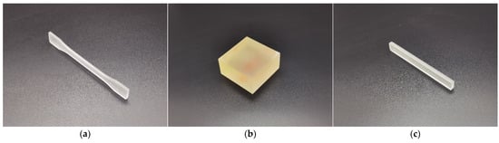 Actual photograph of the fabricated samples. (a) For the detection of tensile strength; (b) for the detection of compressive strength; (c) for the detection of flexural modulus.