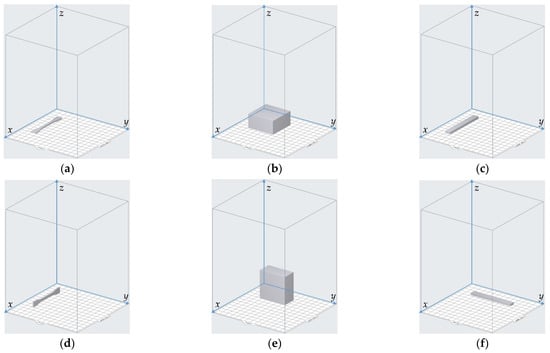 Adjustment of the printing orientations in the Preform software. (a) Default place of the sample for the detection of tensile strength; (b) default place of the sample for the detection of compressive strength; (c) default place of the sample for the detection of flexural modulus; (d) rotation 90° relative to the x–axis; (e) rotation 90° relative to the y–axis; (f) rotation 90° relative to the z–axis.