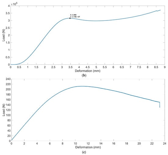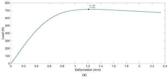 Based on the experimental data obtained in the detection process, the mechanical properties of the detected resin samples with different printing orientations were calculated through Equations (1) and (2) corresponding to tensile strength σb and compressive strength σbc, respectively. In Equation (1), Fb is the maximum force during the yield stage and So is the original middle sectional size 5 mm × 2 mm of the sample. For the cross-sectional experimental result of tensile strength in Figure 5a, it can be seen that the maximum force during the yield stage was 714.3 N, so the tensile strength σb can be calculated as 71.43 MPa. In Equation (2), P is the maximum force during the compression process and A is the sectional size 50 mm × 50 mm of the sample in the compression direction. For the cross-sectional experimental result of compression strength in Figure 5b, it can be seen that the maximum force during the compression process was 3.156 × 105 N, so the compressive strength σbc can be derived as 126.24 MPa.