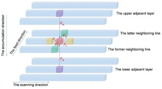 According to the fabrication process in the SLA [41,42,43,44], it can be seen that the fabricated resin sample consisted of large amounts of microparticles, which were controlled by the size of the laser spot and the thickness of each layer, and the force analysis for a single microparticle is shown in Figure 7. The red block, yellow blocks, green blocks, and purple blocks represent the analyzed microparticle, the nearby microparticles within the line show the scanning direction, the nearby microparticles in the neighboring lines show feed direction, and the nearby microparticles in the adjacent layers show accumulation direction, respectively. It can be observed that the force Fil existed within each line, force Fnl among the neighboring lines, and force Fal among the adjacent layers. The mechanical properties of the fabricated resin sample were the vector superposition of these forces. Taking into account the fabrication process of SLA, the order of three kinds of forces from large to small was Fil, Fnl and Fal, sequentially. Moreover, the reference coordinate system of Preform software supported by the Form3 3D printer treated x–axis, y–axis and z–axis as the feed direction, scanning direction, and accumulation direction, respectively.