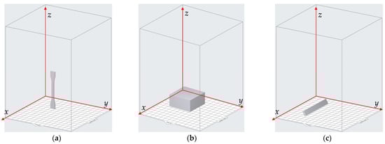 According to the optimal parameters for single mechanical properties in Table 6, the corresponding printing orientations in the Preform software are shown in Figure 8, which correspond to the optimal printing orientation for best tensile strength σb, that for best compressive strength σbc, and that for best flexural modulus E, respectively. It can be intuitively judged from Figure 8 that the optimal printing orientations for each single mechanical property were quite different, and they were further qualitatively discussed one by one in the following part based on the force analysis.