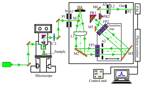 The optical arrangement of a micro-Brillouin scattering apparatus is shown in Figure 2 [44]. The tandem multi-pass Fabray-Pérot interferometer, (FP1 and FP2), was designed by Sandercock (JRS, Zwillikon, Switzerland). The laser is focused on the sample with the help of a small mirror in the optical microscope arrangement. The scattered light enters FP1 via pinhole P1 and aperture A1 and is collected by the objective lens. The laser light is then directed via mirror M3 to FP2. The light strikes the 90°-oriented prism PR1 after the transmission through FP2, then is reflected backwards and returns to FP2. It continues via aperture A2 to FP1. The light is then passed via L1 and is focused onto mirror M4 with mirror M1 underneath, after the transmission through FP1. Mirror M4 then returns the laser light back to lens L1, and the light is projected to FP1 through M2 after collimation. The light is directed to PR2 through M5 after the final pass through FP2. A bandpass filter is formed by the combination of lens L2, prism PR2, and output pinhole P2. The light is projected onto the photomultiplier (PM) from mirror M6 via aperture A3, lens L2, and output pinhole P2. Finally, a conventional photon counter records the scattered signal.