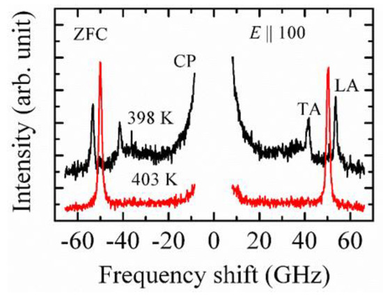 BaTiO3 (BTO) is the first produced and most studied perovskite material with its superior dielectric, ferroelectric, and piezoelectric properties [48]. The high dielectric constants of BTO results from its crystal structure. In BTO crystals, three phonon frequencies were obtained from the FTIR measurements [49], located at around 40, 180, and 482 cm−1. The lowest frequency phonon mode is called the soft mode and is overdamped in a paraelectric phase. From the measured frequency, Luspin et al. [49] estimated the dielectric constant using the Lyddane-Sachs-Teller (LST) relation. Due to the soft mode dynamics, the dielectric constant increases markedly in the vicinity of the phase transition temperature upon cooling. The obtained dielectric constant gives a diverging value by approaching the Curie temperature, while the soft mode frequency remains nearly constant. To explain this discrepancy, two possible origins can be invoked. The first one comes from the contribution of impurities, which gives rise to the rapid increase of the dielectric constant due to the coupling with the soft mode. Another possibility is the existence of an additional relaxational mechanism in the microwave region. However, they had no direct conclusion about this point. Therefore, it is necessary to observe this relaxational mechanism by considering another approach. In BTO crystals, the size of the Ba ion is too large compared with the Ti ion, which is quite small and remains stable in the octahedral position. The Ti ion having a charge of +4 has the minimum energy position outside the center, in the direction of each of the O6 ions surrounding it. Due to the off-centering position of the Ti ions, the mechanism of the phase transition, in particular, the order-disorder- and/or displacive-type, is still under discussion. It was shown by Takahasi [50] and Comes et al. [18] that Ti ions go to the off-center position along eight equivalent [111] directions inside the cubic matrix with a non-zero local dipole moment. Therefore, this leads to a local polar nanoregion (PNR) in a cubic phase, which appears a few hundred degrees above the cubic to tetragonal phase transition temperature (Tc), called the Burns temperature (TB). It is believed that PNRs play an important role in the appearance of the outstanding piezoelectric performance in electrical devices. In order to identify such types of nano-metric local polar regions, a low-frequency inelastic light scattering spectrum can be a very effective tool, because it can be used to directly probe the local symmetry and structure. Figure 3 shows a group of Brillouin scattering spectra at 398 and 403 K without any applied electric fields.