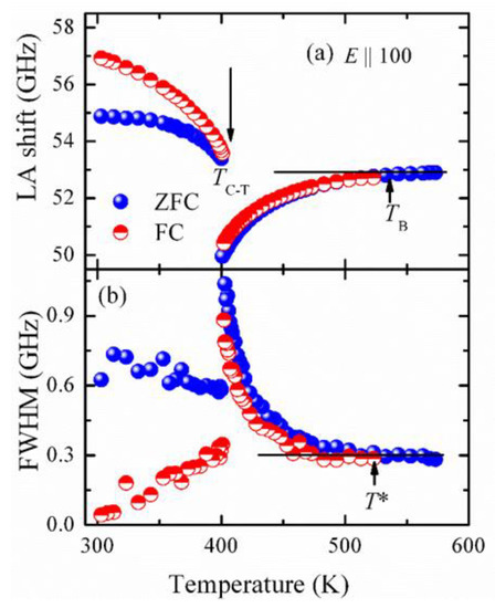 The temperature dependences of (a) frequency shift (υLA) and (b) FWHM (ΓLA) of LA phonon mode of 100-BT single crystals measured in ZFC (blue solid symbols) and FC (red solid half-filled symbols) processes [24].