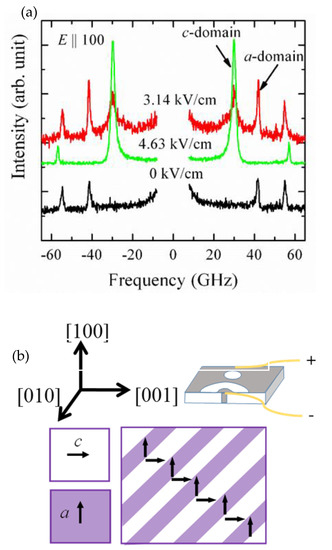 (a) A set of typical Brillouin scattering spectra BTO single crystals in the ferroelectric tetragonal phase at some selected electric fields at 303 K; (b) shows the orientation of a and c domains.
