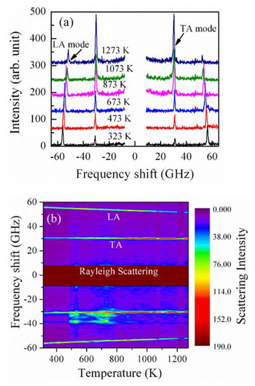 In solid-state physics, the determination of the velocity of an acoustic wave is given by the elastic constant and density. There are many methods to determine the elastic constants. Among them, the ultrasonic pulse-echo method and the mechanical resonance method have been well established [39,40]. However, as a non-contact and non-destructive method, Brillouin scattering spectroscopy is a powerful tool to measure the elastic constants with different external conditions, for example pressure, temperature, and electric field. Such a spectroscopic technique covers a large frequency range between 1 and 1000 GHz, and recently, it has been used to study not only the acoustic phonons, but also the optical soft mode [41], magnetic excitation [42], and localized excitation, such as fracton [43].