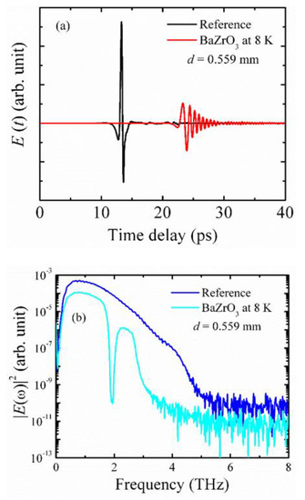 (a) Time-domain waveform and (b) the power spectra of a BaZrO3 single crystal converted from time-domain waveforms at 8 K.