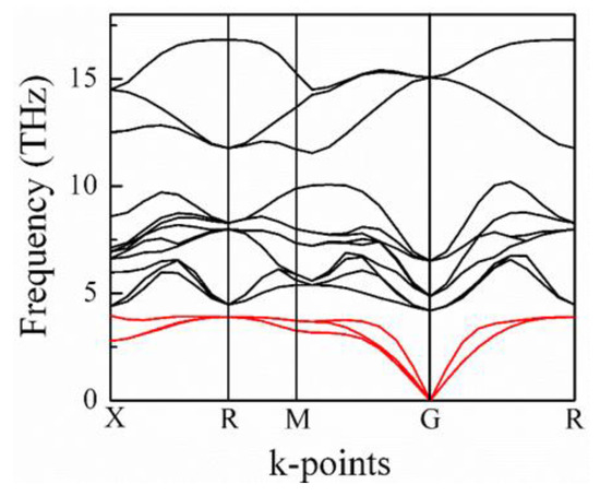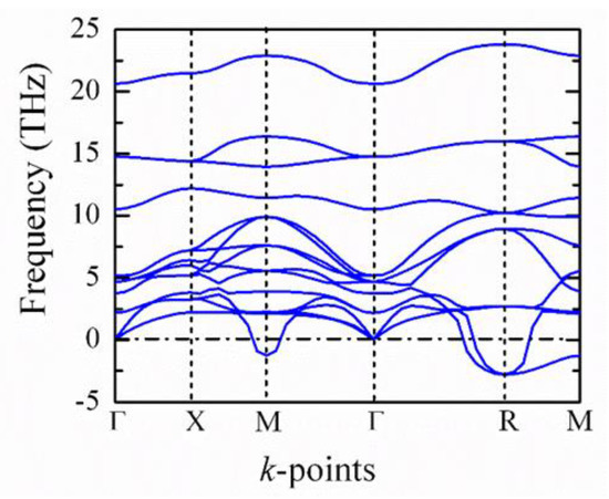 Here, is the sum of A and O ionic radii and is the sum of B and O ionic radii. Generally, leads to the rotation and expansion of B-O6 octahedra. A low-temperature anti-ferroelectric phase is generated due to the octahedral rotations. If , the B-O6 octahedra are stretched from their preferred B-O bond lengths, resulting in the distortions of the B cation by creating room for the B cations to move to the off-center position. In BZO crystals, the values of the ionic radii of Ba and Zr atoms are 1.61 Å and 0.72 Å, respectively, which leads to , so the cubic structure should have no driving force to deform to a lower symmetry. However, the calculation of the phonon spectrum of BZO using DFT calculations is unfavorable to achieve the stable structure of BZO. The phonon dispersion relation for the five-atom unit cell of BZO is shown in Figure 8. The very important characteristics of the phonon spectra are related to the lowest-frequency acoustic phonon branch, which goes to negative at the R- and M-points in the Brillouin zone. However, theses unstable phonon modes were absent in. [78,79], but appeared in [69], where all the calculations were performed using the DFT method. The negative phonon frequencies correspond to the imaginary frequencies, which implies the change of the crystal symmetry. Due to the anharmonic phonon interaction, the negative phonon frequencies may also appear, which are responsible for a structural phase transition of BZO with respect to some external conditions. Therefore, BZO is dynamically unstable, which can change in phase under pressure or an electric field. This observation is consistent with the present Brillouin scattering and THz-TDS results. Indeed, under the applied pressure, very recently, the cubic to rhombohedral Rc and rhombohedral to tetragonal I4/mcm phase transitions at 8.4 and 19.2 GPa, respectively, were observed [75]. A few years before, Yang et al. also observed the pressure dependence of the phase transition from the cubic to tetragonal I4/mcm at 17.2 GPa [70]. We also observed the pressure dependence of the phase transition by first-principles calculations [13].