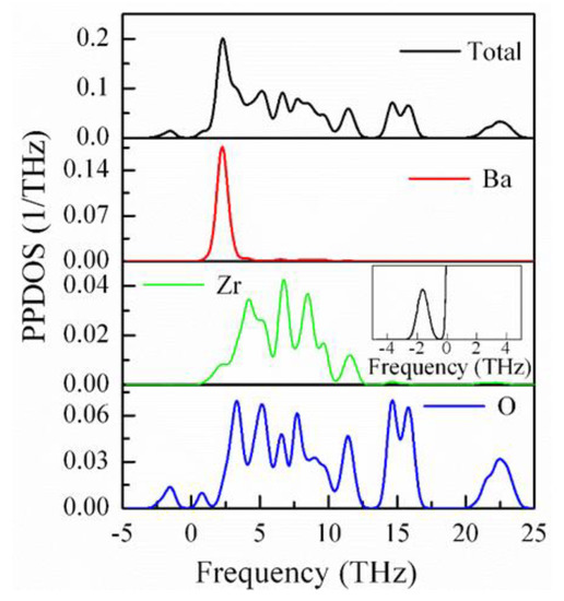 The atomic contribution in the phonon spectra can be seen from the partial phonon density of states (PPDOS), which is shown in Figure 9. It can be noticed from the PPDOS that the negative phonon frequency appears due to the vibration of Zn and O atoms. Therefore, it can be concluded that within the frequency range from 0.5 to 3.0 THz, an unstable phonon mode at the R- and/or M-points of the Brillouin zone is responsible for the phase transition and the superior dielectric and piezoelectric responses of BZO, which correspond to the tilts of the ZrO6 octahedra. Among the perovskite ferroelectric oxides such as PZT [80], this type of unstable phonon mode is observed commonly at the R- or M-points of the Brillouin zone.