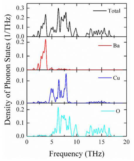 Very recently, another important type of perovskite, BCO, was discovered [36]. BCO belongs to the family of chemically simple perovskite oxides. At a fundamental level, to know the dynamical stability of BCO over the whole Brillouin zone boundary, the phonon dispersion relation is very important. As discussed above, the observation of negative phonon frequencies corresponds to the instability of the crystal symmetry; otherwise, they are considered as dynamically stable. The calculated phonon spectra and PPDOS of BCO at absolute zero temperature along the principal symmetry direction of the Brillouin zone are shown in Figure 11 and Figure 12, respectively. As for BZO, negative phonon frequencies are absent in BCO. On the other hand, at the G-point, the positive value of the low-frequency acoustic phonon (indicated by red color) clearly reflects that BCO single crystals are dynamically stable. So far, there have been no available data, neither experimental, nor theoretical, to compare the present results. From the PPDOS, it is seen that the low-frequency region (1–4 THz) is mainly due to the vibration of Ba atoms, while the intermediate-frequency region (4–8 THz) arises because of the vibration of both the Cu and O atoms. The high-frequency region (above 8 THz) is composed of the vibration of O atoms due to the lower mass.