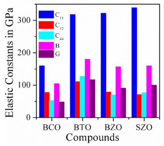 where BV and GV represent the Voigt approximation, BR and GR indicate the Reuss approximation, and B and G have been calculated following the Voigt–Reuss–Hill approximation. The hardness of a material strongly depends on C44 and G. In order to check the hardness of the other well-known perovskites, we compared our results with BTO, BZO and SrZrO3, which is shown in Figure 12. From Figure 13, it can be noticed that BCO has a smaller value of not only B and C44, but also the other elastic moduli, which should result in BCO being a soft material. Therefore, in comparison with those perovskites, BCO is more suitable for use as a thermal barrier coating substance.