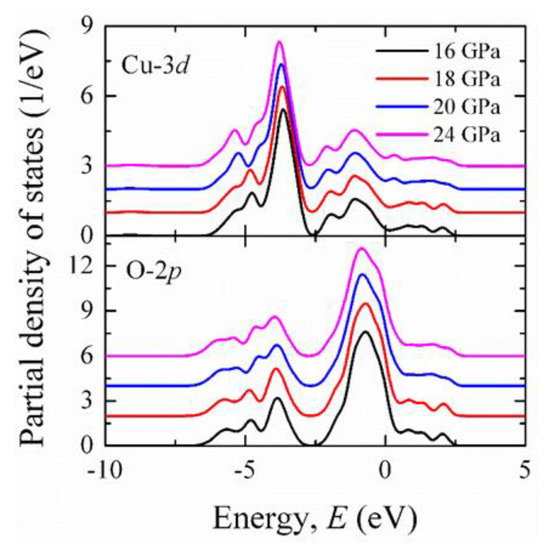 To explain these observations, we calculated the pressure dependence of the partial density of electronic states, which is shown in Figure 15. It can be noticed from the pressure dependence of the partial density of states that there is a prominent hybridization between the neighboring Cu-dx2−y2 and O-2px orbitals at 18 GPa, which is supposed to screen the Cu core holes, resulting in the decrease of the peak intensity.