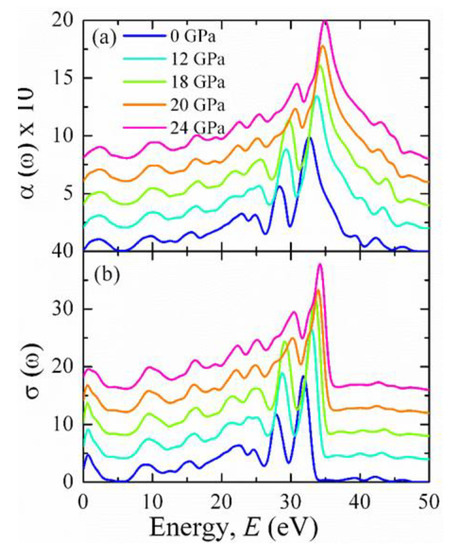 Significant absorption at zero photon energy was observed in BCO, as shown in Figure 16a, indicating the metallic nature. Many peaks were observed in the absorption spectrum. However, the intensities of these peaks in the IR and visible regions were small compared to the UV region. At around 27 and 31 eV, two intense peaks were observed. As a result, the solar spectrum in UV regions can be absorbed by BCO. The real part of the photoconductivity (σ) of the BCO crystal is displayed in Figure 16b. It is seen that σ has a finite value at zero photon energy, which reflects the metallic conductivity of BCO, totally consistent with the results of the absorption and dielectric constant. The finite value of σ can be increased owing to the absorption of the photon with sufficient energy. The maximum value of σ was obtained in the UV region. A sudden jump and decrease of intensity of a peak around 27 eV can be noticed from Figure 16a,b with increasing pressure, which might be associated with the transition from the initial state 2p63d9 to the final state 2p53d10. Overall, there are no studies on pure BCO to compare the result. Many studies are required for the superconducting BCO to understand the basic mechanism of its superconductivity.