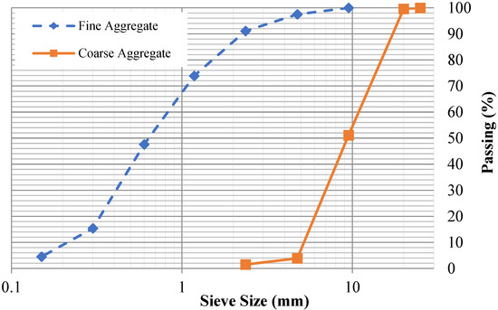 The quarry with the best fine aggregates is located in Lawrencepur, Pakistan. Sieve analysis test was performed in accordance with ASTM C136–05 [44] and the result is graphically shown in Figure 1. The fine aggregate (Lawrencepur sand) used in this research gave the fineness modulus of 2.70. Specific gravity and water absorption of fine aggregate (sand) were assessed in accordance with ASTM C 128-04a [45] and numerical values of 2.63 and 1.18% were obtained.