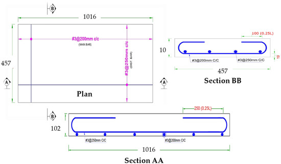 Past research evaluating the mechanical properties of mixes with partial replacement of cement with various industrial by-products suggested an optimum percentage of 15% for SF, 20% for fly ash and 0.5% for PPF [50,51,52]. ACI 549 [53] recommends a workable mix of mortar matrix with sand:cement of 1.4–2.5 and water:cement of 0.30–0.55 by weight of the matrix. The present research used a mix design of 1:2:0.50 (cement:sand:water) to cast ferrocement slabs of all groups tabulated in Table 5. The aim was to get the welded mesh fabric fully packed and densely coated with matrix while achieving maximum density, permeability and design strength. A total of 27 ferro-cement mortar cubes (9 for each of the three groups, i.e., A1, B1 and C1) and 9 reference concrete cubes with a mold size of 70.7 mm × 70.7 mm were cast and tested at a curing age of 3, 7 and 28 days as per the recommendation of the British Standard (BS 4550-3.4:1978) [54] and (BS-1881-116:1983) [55]. To evaluate the flexural performance, a three-point bending test was conducted. A total of 13 ferrocement slabs were divided into three groups, i.e., A1, B1 and C1 with 0.10%, 0.30% and 0.50% of PPF and 10% of SF, including one control slab. Furthermore, in each of the groups above, the percentage of steel ratio was varied (1, 2, 3 or 4 layers of 5.2 mm mesh) with an equivalent area of steel as the control slab. A mix ratio of 1:2:4 was adopted for the control slab and 1:2 for mortar used in ferrocement slabs. The slab specimen dimensions were 1016 mm (40 inches) in length × 457 mm (17.99 inches) in width × 102 mm (4.01 inches) in thickness for the 3-point bending test. All the steel molds were cleaned, oiled and tightened to prevent displacement when casting ferrocement and control slabs. Using glass spacer cover blocks, a clear cover of 3 mm (0.12 inches) was maintained in the formwork to cast ferrocement slabs. Firstly, sand, cement and SF were dry mixed. After that, 70% of water was added to the dry mortar matrix. The remaining 30% of water was added along with varying percentages of PPF. Finally, the mortar matrix was prepared, and mortar was placed into the formwork to cast ferrocement slabs. After 28 days of curing, all the ferrocement and control slabs were tested in flexure mode. Two coats of whitewash were applied on all four sides of the slab to clearly observe the crack patterns under flexural loading. The reinforcement details of the control and ferrocement slab are shown in Figure 4 and Figure 5. The detailed description of slabs cast in the experimental work and their designation are listed in Table 5 and graphically presented in Figure 6.