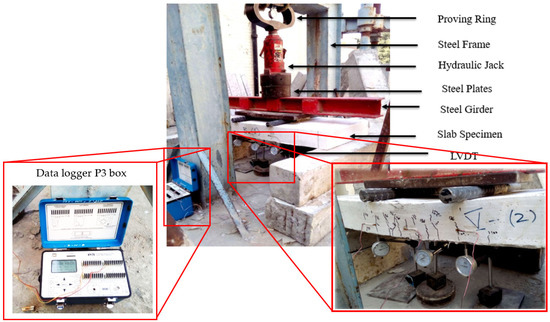 This experimental study intends to evaluate the effect of SF incorporation along with PPF on the ferrocement slab behavior and mortar properties. For compression testing, a total of 36 mortar cubes were cast and tested at 3, 7 and 28 days of curing age. The results and discussion section presents the average values for the compressive strength of these cube specimens. A total of 12 ferrocement slab specimens and one control slab were cast and tested in flexure under 3-point loading as per ASTM C 78-02 [56]. The slabs were supported with a clear span of 1016 mm (40 inches). The experimental setup is shown in Figure 7. A proving ring of 3000 kN (674,426.83 lbf) capacity was used along with a hydraulic jack, steel plates and girders. The load was applied using a hydraulic jack in small increments; the mid-span deflection and strain of the center of the slab were recorded up to failure using linear variable displacement transducers (LVDT) and strain gauges. The increment of load in the proving ring was kept uniform (5 division interval) to observe the overall behavior of ferrocement and control slabs. The applied load and deflection were recorded in kilonewton (kN) and millimeters (mm). For every increment of load, the readings of LVDTs were carefully noted. The strain gauges were used to measure the strain response, and the data logger P-3 box recorded the data. After testing of slabs, their deflections and strains were noted. The following formula was used to calculate the flexural strength.
