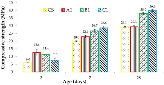 Compression test on cube specimens was performed to evaluate performance in a hardened state and summarized experimental results are graphically presented in Figure 8. X-ray diffraction (XRD) and scanning electron microscope (SEM) results in the literature showed that PPF does not participate in any chemical reaction [57]. Moreover, the PPF entrain small amounts of air during the surface treatment in their manufacturing process. Therefore, adding a higher percentage of PPF creates a more interfacial transition zone in concrete and results in a slight reduction of density and subsequently, the compressive strength [58]. This decreasing trend in compressive strength of ferro cement mortar cubes can be seen in Figure 8 at 3 days of curing age. However, the mechanical properties of fiber-reinforced concrete are affected by the distribution of fibers in the mixture, which can be enhanced significantly by adding SF, fly ash and slag [59,60]. It can be seen from Figure 8 that the incorporation of SF and increased percentages of PPF resulted in improved compressive strength of the mortar matrix at 7 and 28 days of curing age. The additionally added SF assisted in the dispersion of PPF, resulting in increased strength through improving the cement paste-aggregate bond [61,62]. Among the different cube specimens tested after 28 days of casting, ferro-cement cube (C1) with 0.5% PPF and 10% SF demonstrated the highest compressive strength of 39.9 MPa, which is 37.1% greater than the 29.1 MPa strength of control mix (CS) without PPF. The lower dosage of PPF (0.10% and 0.30%) also improved the 28 days compressive strength of CS cubes from 29.1 MPa to 29.3 MPa and 38.0 MPa, respectively. The comparatively higher compressive strength of ferro-cement cubes resulted from SF and increasing dosage of PPF fibers, effectively holding the micro-cracks propagation in concrete mass [63].