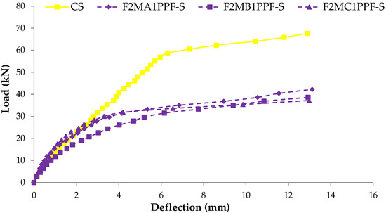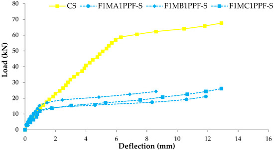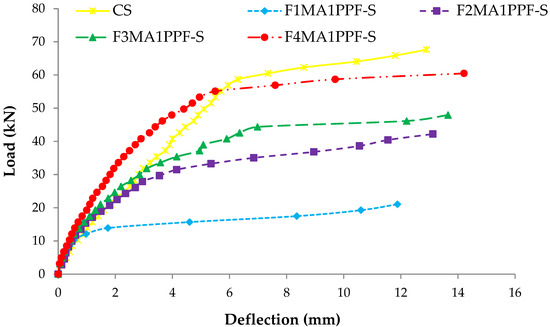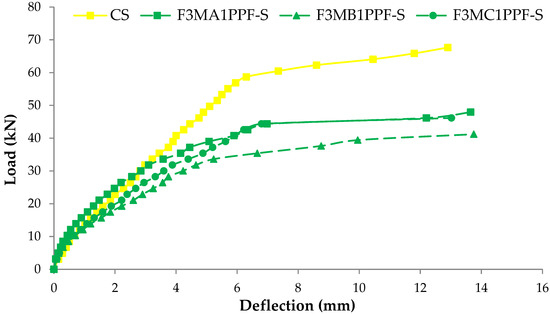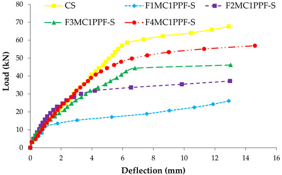 The load at which the first crack appears is called “First Cracking Load.” In control and ferrocement slabs, these cracks appeared in the center of the span and moved upward, showing pure flexural failure. Consistent with the material cube strength, the first cracking load of ferrocement slabs tested in flexure also demonstrated a comparatively higher load by adding PPF. Figure 9 shows the graphical representation of the first cracking load of different ferrocement slabs and control specimens. C1 group specimens endured the maximum value of the first cracking load with a maximum percentage of PPF. The specimen F4MC1PPF-S with 0.5% PPF and four layers of wire mesh, i.e., equivalent area of steel as that of the control slab (CS), showed a cracking load of 40.8 kN, which is 15.2% higher than the control slab (CS) with a first cracking load of 35.4 kN. This is due to an increase in specific surface area of mesh reinforcement, cumulative strength of steel meshes that were uniformly dispersed along the cross-section, and an increasing percentage of PPF [64]. The increased cracking behavior was evidently due to the contribution of PPF fibers, which acted as crack arrestors that helped to bridge the cracks increasing the first cracking load [65]. In group F3MB1PPF-S (Figure 9), corresponding to 0.30% of PPF and three layers of wire mesh (75% of steel area), the first cracking load is 22.9 kN which is even lower than F2MB1PPF-S with two mesh layer (25% of steel area) of the same group. This may be due to the premature failure caused by buckling/slippage of wire mesh in the mortar matrix.