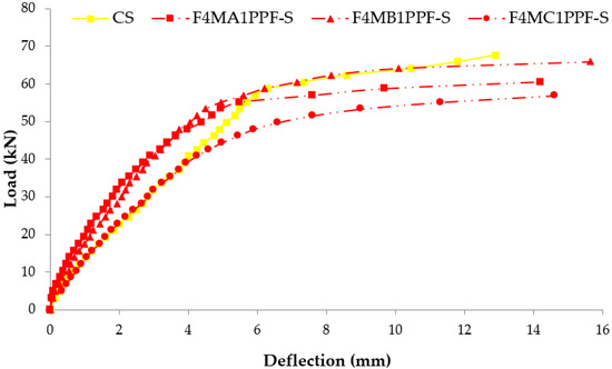 The comparison between load-deflection behaviors of ferrocement slabs with control slabs is plotted in Figure 11, Figure 12 and Figure 13. In contrast, the comparison of load-deflection for different percentages of PPF and varying numbers of steel wire mesh is presented in Figure 14, Figure 15, Figure 16 and Figure 17. All the load-deflection curves pass through elastic to failure stages [67]. As the reinforcement ratio increases in all the three groups i.e., A1, B1 and C1, there is a tremendous increase in load-carrying capacity and deflection among the ferrocement slabs. The deflection values of group A1 measured at failure points show an increased deflection behavior by 1.70%, 5.81% and 10.15% for mesh layers two, three and four, respectively. The maximum deflection of 11.9 mm is endured by F1MA1PPF-S, which is 7.96% less than the control slab deflection of 12.9 mm because of a lower percentage Vr of reinforcement, i.e., 0.429%. The deflection values of group B1 measured at failure points show an increased deflection behavior by 0.23%, 6.59% and 22.09% for mesh layers two, three and four, respectively. The deflection value measured at the failure point decreases behavior by 33.33% for mesh layer one, F1MB1PPF-S, compared to the control specimen. The reason is the slippage of steel mesh in the mortar matrix. F4MB1PPF-S contains maximum load-carrying capacity as compared to other groups A1 and C1 due to an excellent bonding effect of 0.30% of PPF with the cumulative effect of equal distribution of meshes along the cross-section; as a result, there is an increased behavior of deflection and strain as compared to mesh layer of other groups. The 0.30% of PPF tends to stretch more effectively in the face of crack separation. As a result, the load-carrying capacity is nearly equivalent to that of the control specimen. The deflection values of group C1 measured at failure points show an increased deflection behavior by 0.62%, 0.93% and 13.17% for mesh layers two, three and four, respectively. The load-carrying capacity of this group containing 0.50% of PPF is less than group A1 and B1 because higher percentages of PPF resulted in decreased cohesion and bond strength between mortar matrix and meshes [66]. The reason is that higher dosage rates are reducing the strength of the mortar matrix because higher volumes in fibers interfere with the cohesiveness of the mortar matrix.