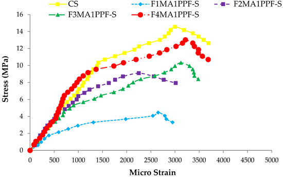 The comparison between the stress-strain behavior of ferrocement slabs and control slabs (CS) is plotted in Figure 18, Figure 19 and Figure 20. The stress-strain curve represents a behavior similar to the load-deflection curve. The strain at maximum flexural stress for F1MA1PPF-S is 0.0027, which is 11.67% less than the control specimen due to a comparatively lower percentage of Vr for wire mesh reinforcement. Similarly, for F1MB1PPF-S, the strain at maximum flexure stress is 0.00212, which is 29.33% less than the control slab due to slippage of wire mesh in the mortar matrix. The strain noted at maximum flexural stress for F1MC1PPF-S is 0.00213, which is 29% less than the control specimen, mainly due to a lower percentage of Vr of reinforcement in the loading direction.