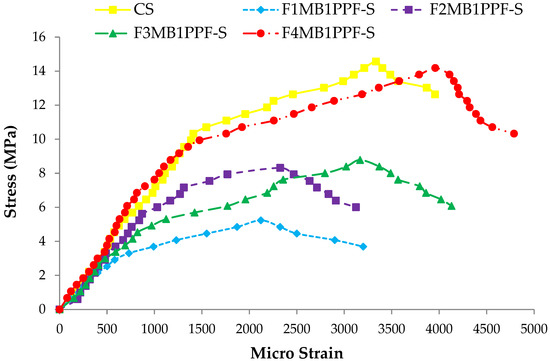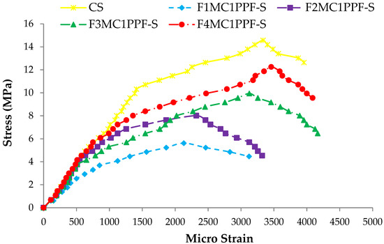 - Increasing strain at peak stress and extended length of descending branch for the stress-strain curve was observed with an increased percentage of polypropylene fibers in the mixture.