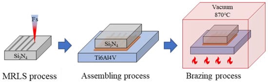 Laser-induced periodic surface structures (LIPSSs) are important for fabricating surface microstructures [9,10,11,12]. LIPSSs are periodic nanostructures fabricated on the surface of metal materials using a pulsed laser to prepare micro/nano secondary surfaces with hydrophilic structures [13,14]. Chen et al. [15] used a laser to texture Ti3SiC2 ceramics to improve their wettability. After surface treatment, the wetting angle of the brazing filler on the ceramic was reduced from 59.6° to 25.7°, and the wettability was significantly improved. The brazing filler was uniformly filled into the machining groove, and the interface-forming effect was excellent. The surface microstructure morphology had a direct impact on wettability. With the change in the surface microstructure spacing, the wetting angle fluctuated [16]. Liu et al. [17] found that the Al–Si alloy had poor wettability on the surface of microgrooves and micropits, whereas the Al–Si alloy showed better wettability on the micro/nanoripple surface; this is attributed to the formation of micro/nano-layered patterns and the result is improved capillary action. Pardal et al. [18] performed spot welding on steel after forming a surface microstructure. Molten aluminum deeply penetrated the steel surface microstructure, and the maximum tensile shear strength of the joint increased by 25%. The machined surface microstructure played a role in homogenizing the nugget of the solder joint and improved the welding quality. Zhang et al. [19] fabricated a surface microstructure to achieve brazing between Al2O3 and stainless steel. The maximum joint strength reached 66 MPa, which was 2.7 times that of the untreated brazed joint. The spacing between the surface grooves affected the joint performance. When the groove spacing was large, the stress distribution in the brazing process improved, and it was difficult for the cracks to expand.