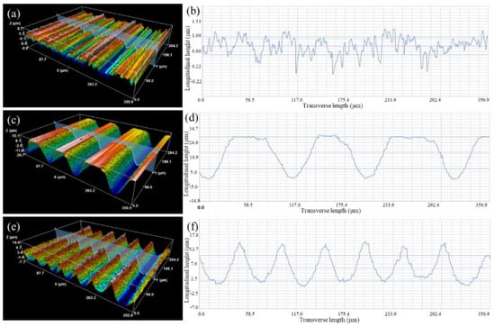 Figure 2 shows the three-dimensional morphology and roughness of the Si3N4 ceramic surface texture. The MRLS was obtained at a laser power of 110 W; line spacings of 100 μm (loose type) and 50 μm (dense type); and the corresponding trench structures were loose and dense, respectively.