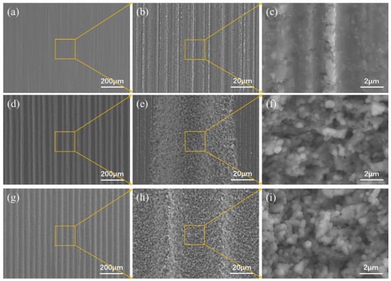 The surface of the pristine Si3N4 was relatively flat and had evident stripes with a small roughness (0.18 μm, as shown in Figure 2a). Figure 2b shows the loose groove-like texture on the surface after laser processing, with a line spacing of 100 μm. The grooves were large, the depth reached 35.79 μm, and the roughness increased to 9.83 μm. During laser texturing, the line spacing was larger than the width of a single ridge, and the micro–nano structures, formed on the previous path, were not etched in the next round of laser scanning. Figure 2c shows the formation of a dense, groove-like, textured surface with parallel, ridge-like protrusions, and the width of a single protrusion was approximately 100 μm. The center line of the ridge-like protrusion coincided with the scanning path of the laser, in which the tiny grooves and larger grooves constituted a “light trap” structure. During laser texturing, the Si3N4 surface quickly absorbed heat and melted, and small holes with large aspect ratios were thus formed. The pressure generated by the steam in the small holes squeezed the vaporized Si3N4 to move to both sides and form ridged protrusions after solidification (Figure 3f,i). The roughness was 3.71 μm, and the groove depth reached 21.11 μm.