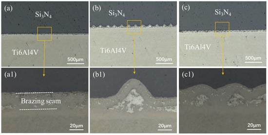 Interfacial microstructure of brazed joints of Si3N4–titanium alloys with different surface structures: (a,a1) pristine surface; (b,b1) loose surface; and (c,c1) dense surface.