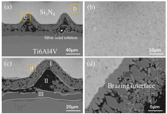 Brazing interface of the Si3N4–titanium alloy joint with a loose surface: (a) low-magnification microstructure; (b) the microstructure of Si3N4; (c) low-magnification microstructure (the black area shows holes that are not filled, which should contain the silver solid solution); and (d) brazing interface.
