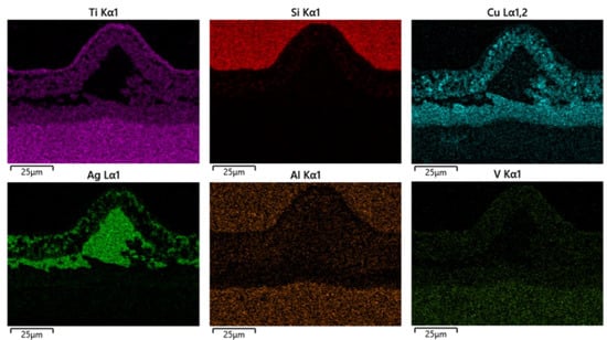 The MRLS was designed to improve the mechanical properties of Si3N4–titanium alloy joints and to reduce the joining defects. Figure 4 shows the typical interface structure of the joint obtained by brazing Si3N4 under a brazing temperature of 870 °C and a holding time of 10 min as the process parameters, and using MRLS to assist the AgCuTi braze filler. After brazing, there were no hole defects at the brazing interface, and the formation was good. Based on the microstructural distribution characteristics of the brazing seam interface, the interface of the brazed Si3N4–titanium alloy joint was divided into three regions: I, II, and III, and the overall width of the brazing seam was approximately 25 μm, as shown in Figure 5. Regions I and III have the same organization, which is the interfacial reaction region near Si3N4 and the titanium alloy; further, region II is the center region of the brazing seam. Throughout the brazed joint, the MRLS remained intact and formed strong metallurgical bonds with the brazing filler metal. An enlarged view of Region I shows that the central region of the brazing joint contains a gray matrix and white dotted phases; additionally, the gray phases were tightly connected to Si3N4 and facilitated by nanoparticles. Based on the elemental analysis (Figure 6), the white phase is Ti–Cu, and the white dotted phase is the silver solid solution.