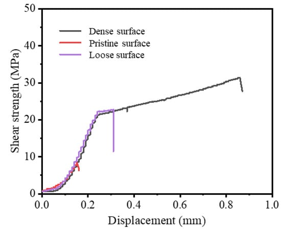 Figure 7 shows the force–displacement curves of the Si3N4–titanium alloy joints before and after the introduction of MRLS. The holding time was 10 min, the brazing temperature was 870 °C, and the room-temperature shear strength of the joint increased gradually. The maximum shear strength was only 10 MPa without the MRLS, and the joint strength improved significantly after the introduction of MRLS. When a dense structure was adopted, the strength increased by more than 300%. Interestingly, the displacement of the joint increased significantly during the shearing process with the introduction of the MRLS, indicating a considerable improvement in the impact resistance of the joint. Based on the texture characteristics of the MRLS, we believed that the large increase in shear displacement was attributed to the groove structure, which enhanced the mechanical interlocking ability between the brazing seam and Si3N4.