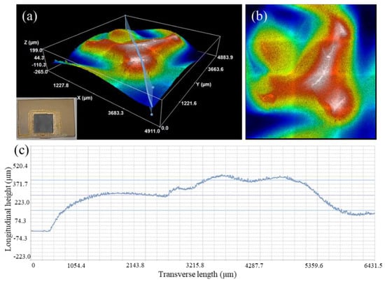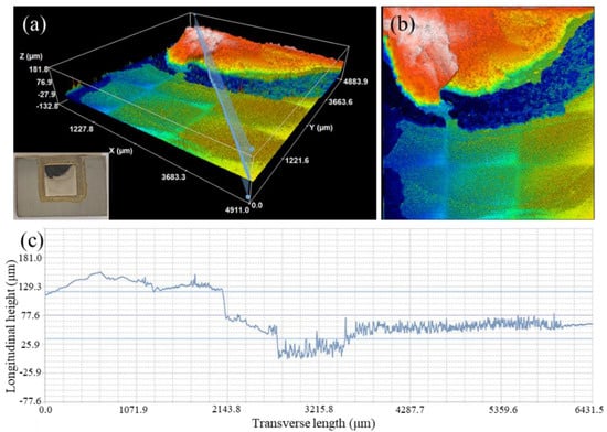Fracture morphologies of brazed joints after introducing the MRLS. (a) three-dimensional view of the fracture morphology, (b) top-view of the fracture morphology, (c) height profile on the cross-section in figure (a).