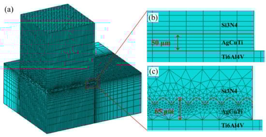 A finite element analysis (FEA) was performed according to the theory of thermoelasticity and plasticity. ABAQUS software was used to simulate the residual stress field of the brazed joint during cooling and the temperature was reduced from 870 °C to 20 °C. Since the static implicit analysis step was used to solve the problem, the simulation time had no effect on the simulation results. The grid division module used C3D8R cell type. The original sample had 133,740 cells and 143,027 nodes; the dense groove joint sample had 361,176 units and 472,474 nodes. It has been assumed that only elastic deformation occurred in Si3N4, and elastic–plastic deformation occurred in the brazing layer. The various performance parameters of materials required for the finite element calculation can be found in the literature [24,25,26]. To directly relate the residual stress to the shear strength, a finite element mesh was drawn with the size of the actual shear specimen. The sizes of the Si3N4 and titanium alloy were 5 × 5 × 3 mm3 and 15 × 10 × 3 mm3, respectively. In consideration of the distribution characteristics of the residual stress of the brazed joints, a nonuniform mesh division of the brazed joints was performed. The meshes in the area near the interface, between the brazed joint and the base metal, were relatively dense, which therefore improved the accuracy of the simulation results. Figure 10 shows these meshes.