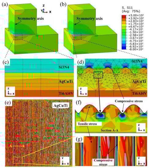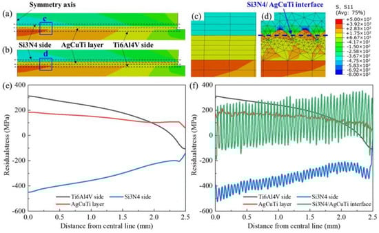 For the joints directly brazed with AgCuTi, an evident stress concentration formed in the brazing seam, as shown in Figure 11 and Figure 12. There was also a stress concentration phenomenon at the corners of Si3N4; however, it was much lower than that of the brazing joint. These two locations in the joint are prone to the initiation and propagation of cracks. The internal stresses of the upper Si3N4 and lower titanium alloy were symmetrically distributed; however, the residual stress value of Si3N4 near the seam was higher. Therefore, it is more likely to break from Si3N4 when close to the brazing seam.