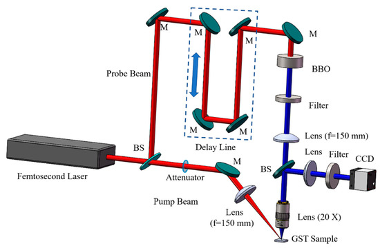 The GST films were deposited on a Si (100) substrate by a magnetron sputtering method from the Ge2Sb2Te5 target with Ar gas flow rate of 35 sccm at room temperature when the sputtering power was 30 W and the thickness was 100 nm, which was measured using a three-dimensional topography instrument. To study the ultrafast dynamics of amorphous, FCC, and HCP crystalline states, the as-grown GST films were annealed at a different temperatures from 150 °C to 350 °C for 30 min, and the different phase states were identified using XRD patterns and Raman spectrum. Then, the ultrafast dynamics of these films with different phase states were investigated using the reflective-type pump–probe shadowgraph imaging technique. As shown in Figure 1, a femtosecond laser (Spitfire, Spectra-Physics Inc., Mountain View, CA, USA) with a wavelength of 800 nm was controlled by a signal generator to emit laser pulses. Then, the generated laser beams were divided into pump and probe beams using a beam splitter (Thorlabs), and the intensity ratio between them was 0.45:0.55. The pump pulse was focused on the samples using a lens with a focal distance of 150 mm at an angle of 45°. The energy of the excitation beam was controlled using an attenuator. The other’s frequency was doubled using a beta barium borate (BBO) crystal. It was focused on the excitation area by the pump beam perpendicularly through a lens with a focal distance of 150 mm and a 20 × objective (NA = 0.45, Olympus Inc., Tokyo, Japan). The influence of the pump pulse was eliminated by a 400 nm bandpass filter. An optical delay line was used to make the probe beam delay to irradiate the excitation area with the pump beam and modify the time delay as precisely controlled using a computer. A charge-coupled device (CCD, Imaging Sources), whose parameters were set by the computer, was used to take reflected optical images. In addition, another 400 nm bandpass filter was used to eliminate the influence of the pump beam and the plasma generated by laser manufacturing of the samples in front of CCD. In the pump–probe experiments, the time delay started at 0 fs to study the ultrafast dynamics, which meant that the pump and probe beam irradiated the sample at the same time. The measured reflectivity was calculated by