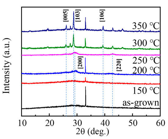 Before studying the ultrafast dynamics of different phase states of GST, the as-grown films are annealed at various temperatures from 150 °C to 350 °C for 30 min, and then measured via XRD (Bruker, D8 focus), as shown in Figure 2. There are no peaks for the as-grown GST films and the films after annealed treatment at 150 °C, which means the films are in an amorphous phase. However, when the annealing temperature is at 200 °C for 30 min, the crystalline face-centered cubic (FCC) state with the peak of [200] emerges, which means that the phase transits from the amorphous state to the FCC structure. While the films are annealed at 250 °C for 30 min, there are peaks of [200] and [220] in the XRD patterns, which are also the characteristics of the FCC structure. As the annealing temperature increases to 300 °C and stays there for 30 min, the new peaks of [005], [103], and [106] are shown in Figure 2, and the HCP structure can be identified according to the peaks. When the annealing temperature continues growing and reaches 350 °C for 30 min, the peaks that emerge from the XRD spectrum are almost the same as those from annealing at 300 °C for 30 min, and the crystallization with hexagonal close packed (HCP) appears.
